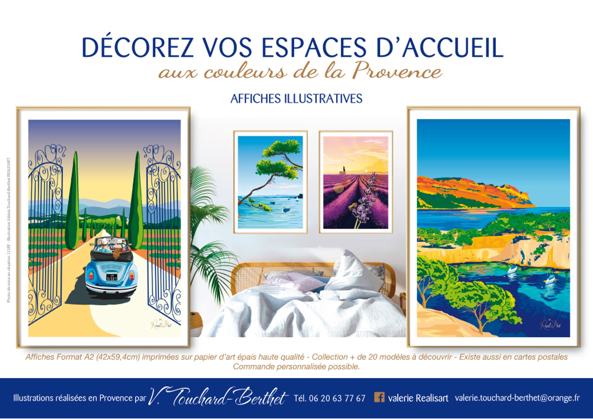 Découvrez les créations uniques de Realis'Art, illustratrice provençale. Plongez dans des paysages lumineux et colorés à travers nos affiches paysages de Provence, cartes postales et objets décoratifs. Ajoutez une touche estivale et chic à votre décoration.